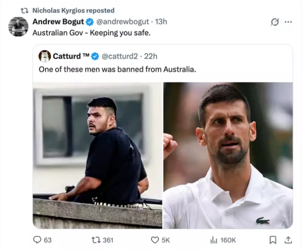 Kyrgios añadió su propio comentario mordaz: “Gobierno australiano – Manteniéndote seguro.”